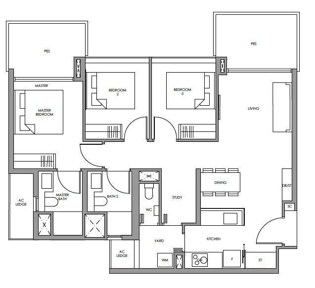| 3 Bed + Study | 1076 - 1130 | 68 |